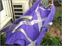 右のスリングの長いものがあります。バルコニーなどから大型の家具など玄関から入らないものを吊り上げたり下ろしたりするときに使います。10メートルの長さのものを2本持っています。3人以上の作業となります。
